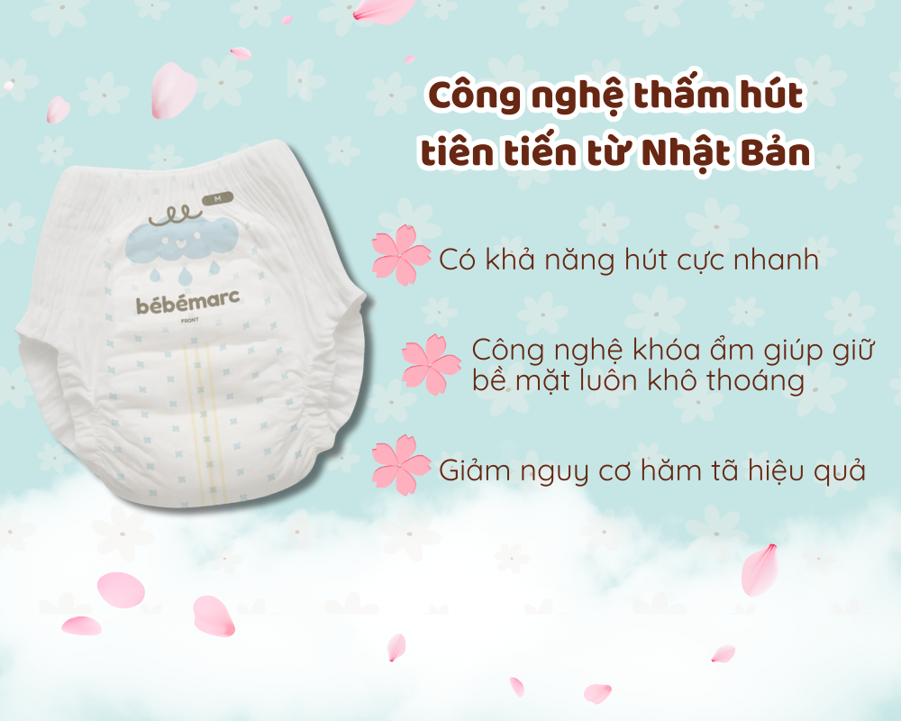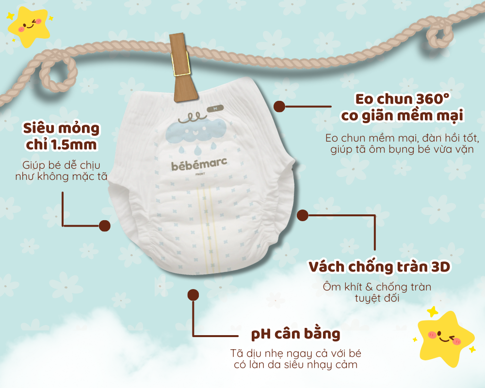 Mẹ luôn mong bé được thoải mái nhất, kể cả trong những điều nhỏ nhất như chiếc tã con mặc mỗi ngày. Với làn da mỏng manh của trẻ sơ sinh, mọi tiếp xúc đều phải thật êm, thật an toàn. Vì vậy, bébémarc tạo nên dòng tã quần đạt chuẩn cao: mềm mịn khi chạm vào da, thấm hút nhanh để luôn khô thoáng, và ôm vừa vặn theo từng cử động hiếu động của bé.