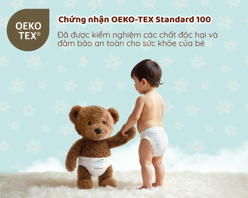 Tất cả vật liệu đều được kiểm định nghiêm ngặt, không chứa các chất độc hại có thể gây dị ứng hoặc kích ứng da bé. Đây là chứng nhận quốc tế uy tín, đảm bảo tã hoàn toàn an toàn ngay cả với trẻ sơ sinh. Bé dùng mỗi ngày, mẹ vẫn hoàn toàn yên tâm.