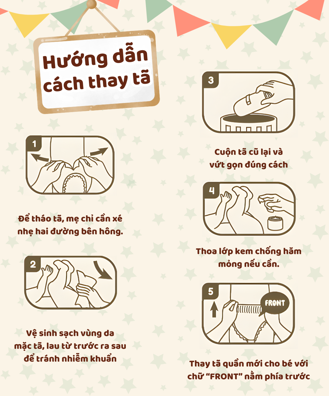 – Vệ sinh sạch vùng da mặc tã, lau từ trước ra sau để tránh nhiễm khuẩn.